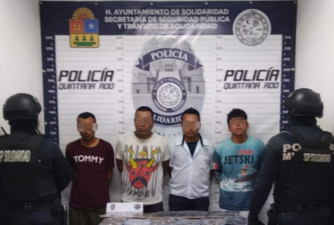 Con acciones contundentes contra la delincuencia, policías de la Secretaría de Seguridad Pública y Tránsito Municipal de Solidaridad aseguraron a cuatro personas en posesión de 77 posibles dosis de narcóticos y una réplica de arma larga, en la colonia Centro.