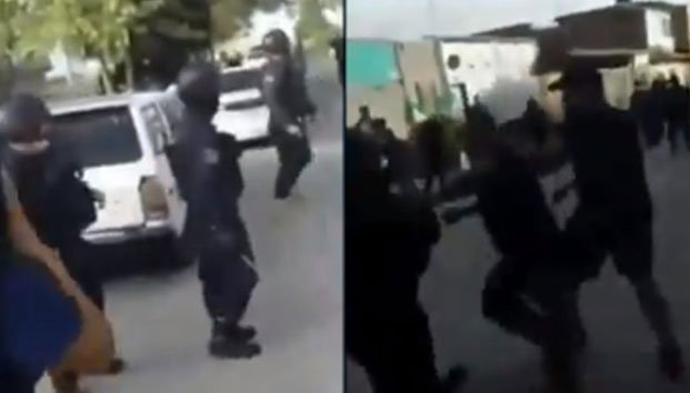En redes sociales, vecinos transmitieron en vivo el momento de la trifulca, donde se observa a mujeres corriendo y gritando, mientras que algunos hombres insultan e intentan golpear hasta con piedras a los uniformados.