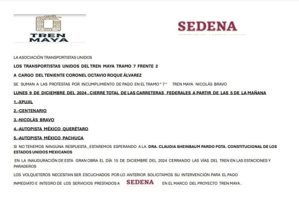 La Asociación de Transportistas Unidos del Tren Maya Tramo 7 Frente 2, encabezada por el teniente coronel Octavio Roque Álvarez, anunció movilizaciones para exigir el cumplimiento de pagos pendientes relacionados con su labor en el proyecto del Tren Maya.