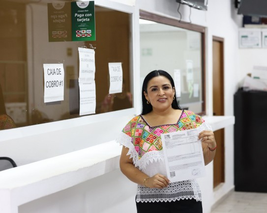 Luego de acudir a la Dirección de Ingresos de la Tesorería Municipal para pagar el Impuesto Predial correspondiente al ejercicio fiscal 2026, la presidenta municipal Blanca Merari Tziu Muñoz se manifestó contenta y agradecida con los contribuyentes que han respondico al llamado para contribuir.