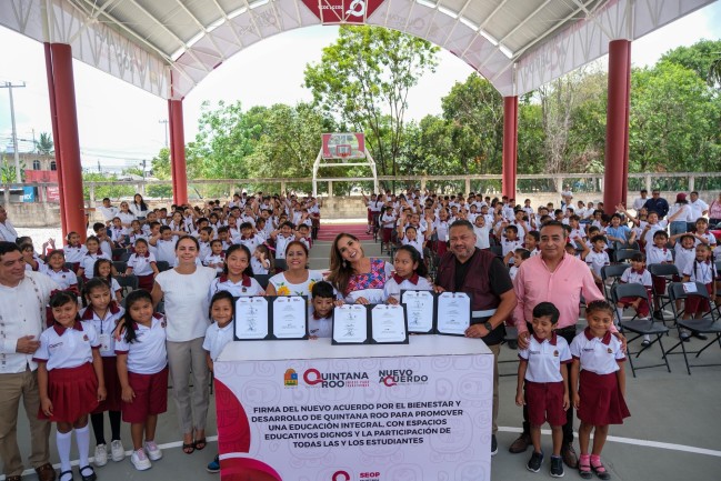En medio de un ambiente festivo y lleno de algarabía, la gobernadora, Mara Lezama Espinosa inauguró el domo de la Escuela Primaria “Efraín Santana Sánchez”, ubicada en Cancún, en un acto que también incluyó la Firma del Nuevo Acuerdo por el Bienestar y Desarrollo de Quintana Roo.