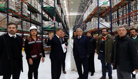 Previo al acto inaugural, el ejecutivo recorrió las instalaciones, ubicadas en Huehuetoca, Estado de México, en las que se observan anaqueles y cajas con medicinas.