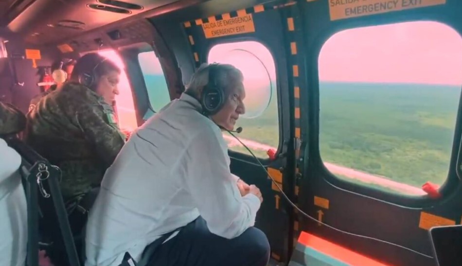 En el video que compartió el presidente AMLO está a bordo de un helicóptero, con audífonos de protección, observando la línea donde se colocará la vía férrea, acompañado de funcionarios y del ejército.