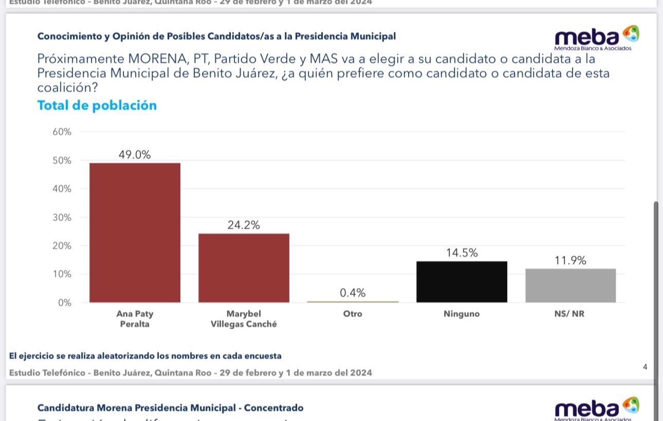 La encuestadora Mendoza Blanco & Asociados (Meba), da la candidatura de Morena a la Presidencia Municipal de Benito Juárez a Ana Paty Peralta con el 49.0% como la favorita para la contienda electoral y con el 71.2% como la más conocida.