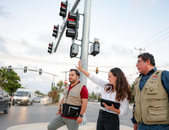 En esta ocasión, la Alcaldesa visitó el cruce de la avenida Orquídeas con avenida Lak’in, donde constató el progreso de la obra de modernización de la red de semáforos, que registra un avance del 58 por ciento. “Este proyecto forma parte de un programa integral que contempla la instalación de semáforos vehiculares y peatonales, así como adecuaciones geométricas para mejorar la circulación y tecnología de control de tráfico enlazada al Centro de Monitoreo” detalló.
