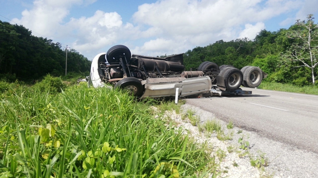 Felipe Carrillo Puerto.- Aparatosa volcadura de un tráiler deja cuantiosos daños materiales que pudieran alcanzar los 300 mil pesos.