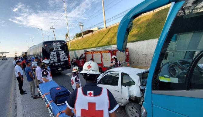 De esta manera, el vehículo particular colisionó la parte posterior de otro autobús de la empresa Xcaret.