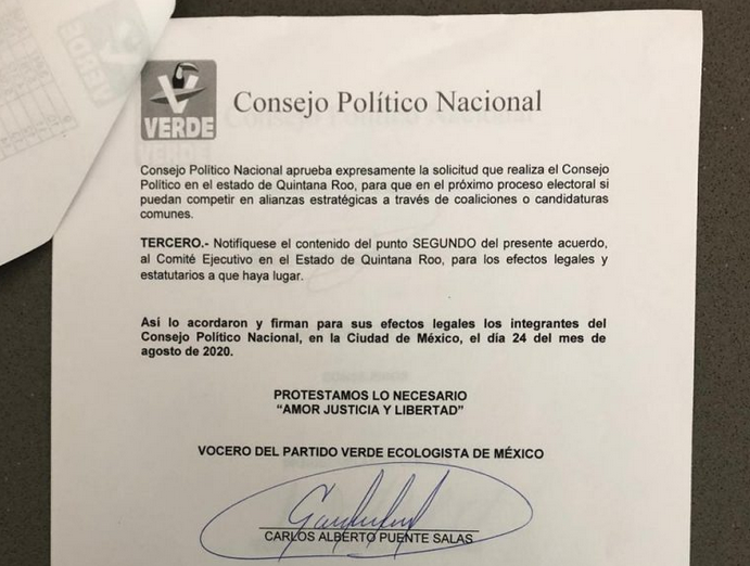 El Consejo Político Nacional del Partido Verde aprobó expresamente la solicitud realizada por el Consejo Político en el Estado de Quintana Roo, para que en el próximo proceso electoral puedan competir en alianzas estratégicas a través de coaliciones o candidaturas comunes, dio a conocer José de la Peña Ruiz de Chávez, secretario general del Comité Estatal.