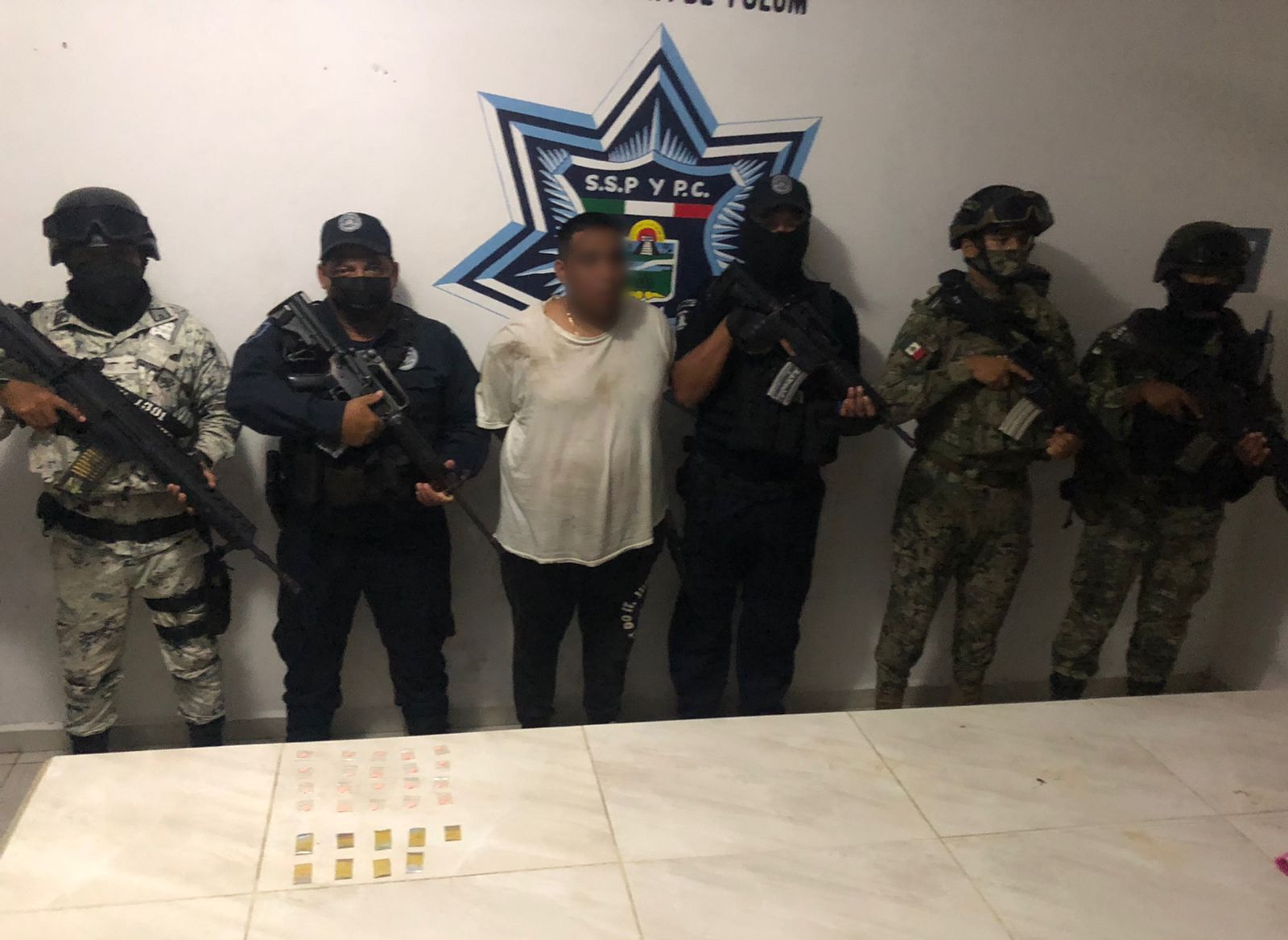 Este presunto narcomenudista fue detenido por elementos de la Secretaría de Seguridad Publica y Protección Ciudadana en coordinación con la Guardia Nacional, SEDENA, Policia Quintana Roo y SEMAR en el marco del operativo “Fortalecimiento de acciones y protección ciudadana en Tulum”.