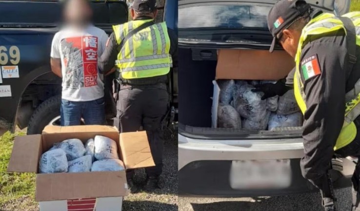 De acuerdo con la información recabada, el personal operativo detectó que el conductor Jorge Alejandro G. V., de 41 años, originario de Quintana Roo, trasladaba en la cajuela una caja de cartón que contenía los paquetes emplayados de manera individual.
