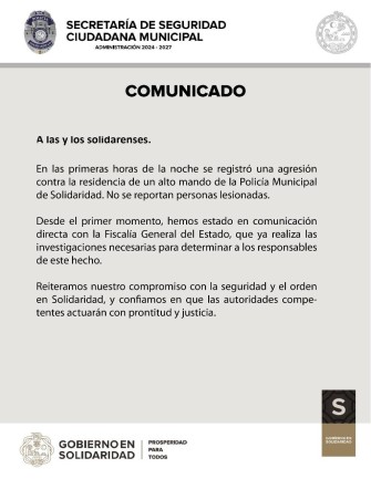 Reiteramos nuestro compromiso con la seguridad y el orden en Solidaridad, y confiamos en que las autoridades competentes actuarán con prontitud y justicia.