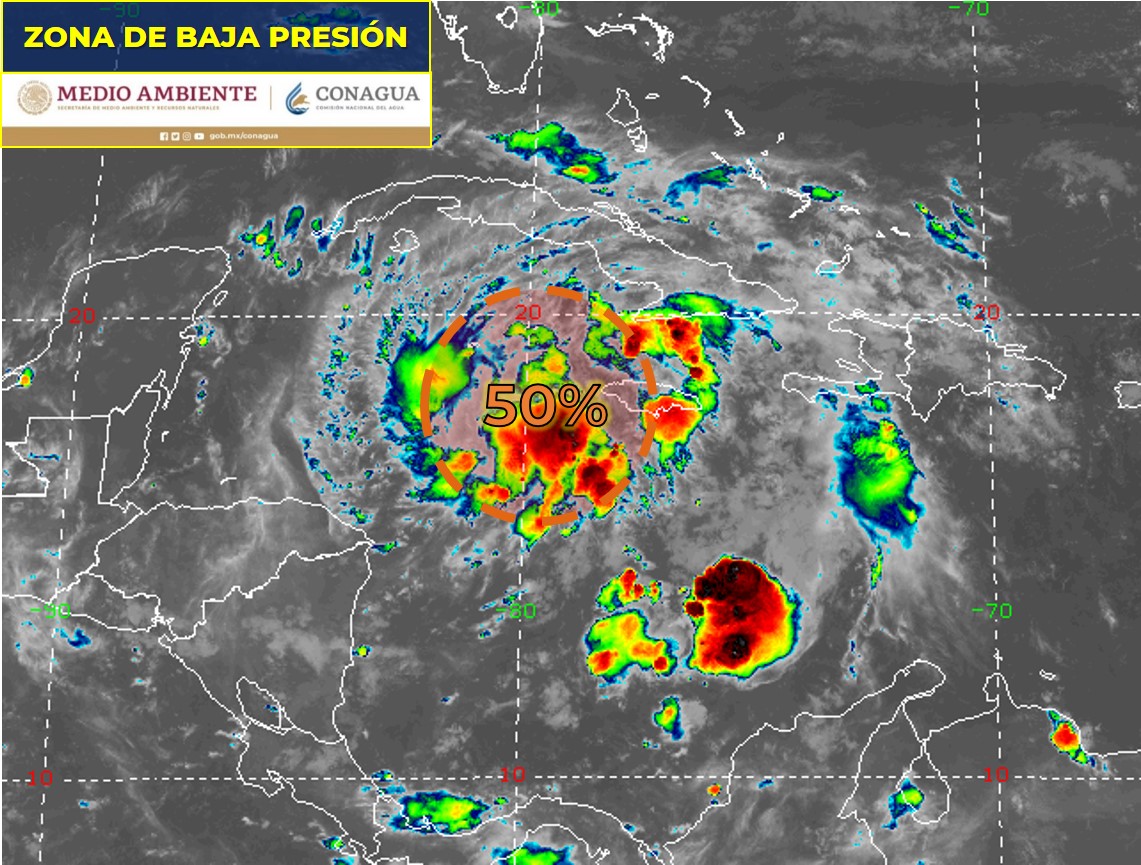 Zona de baja presión al este-sureste de las costas de Quintana Roo, ahora con 50% de probabilidad para desarrollo ciclónico en 48 horas.