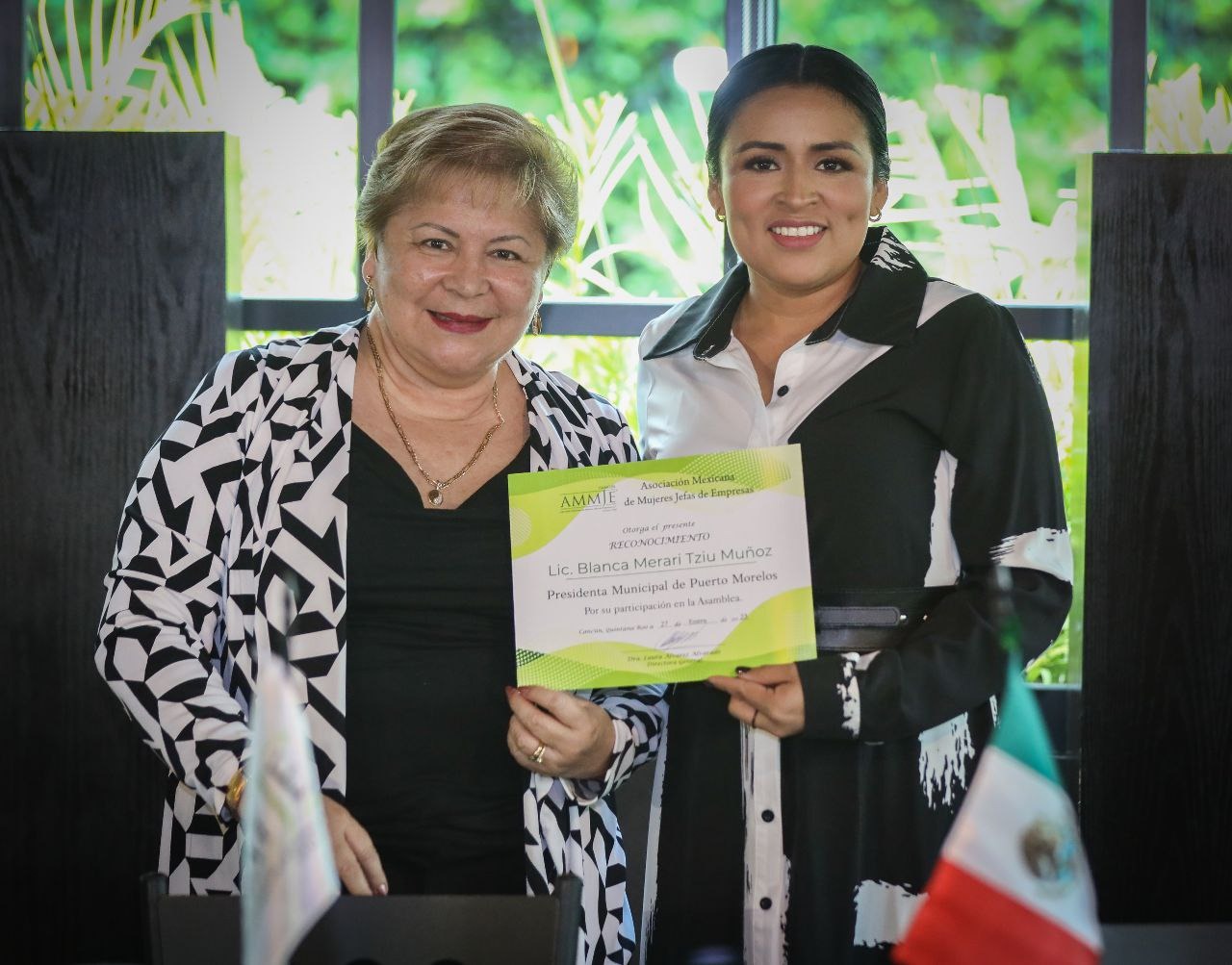 La Presidenta Municipal de Puerto Morelos recibió un reconocimiento por parte de la AMMJE, por su participación en la asamblea mensual. Agradeció a Laura Álvarez Alvarado, titular del organismo, por la invitación a compartir los logros de su administración en materia económica y el impulso que se la ha dado a las mujeres emprendedoras.