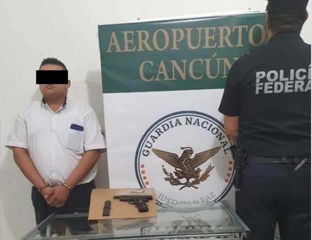 Elementos de la Dirección General de Seguridad en Carreteras e Instalaciones de la Guardia Nacional, detuvieron en la Terminal 2 del Aeropuerto Internacional de Cancún, a un taxista identificado como Victor Manuel M., quien llegó a la terminal aérea a bordo del taxi con número económico 5210, asegurándole un arma corta calibre 45 milímetros; con cargador abastecido con 7 cartuchos útiles y un radio portátil.
