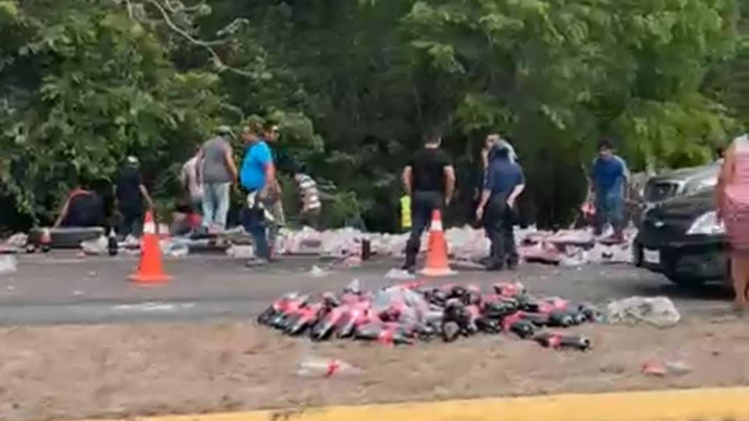 Un camión que transportaba refrescos y aguas de conocida marca se volcó esta mañana en la carretera federal Chetumal – Bacalar, a la altura del hotel y centro holístico Akalkí.