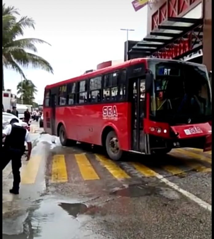 Un camión del servicio público de pasajeros chocó contra un automóvil por ir a exceso de velocidad en pavimento mojado, y acabó por salirse del bulevar Kukulcán y estrellarse contra la fachada de una discoteca, en el kilómetro 8.5 de la Zona Hotelera.