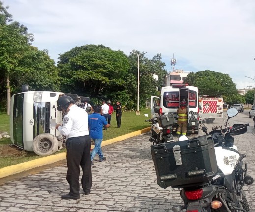 Cancún- Un aparatoso accidente vial se registró la mañana de este lunes 12 de enero de 2026, alrededor de las 11:30 horas, en el cruce de la avenida Palenque con avenida Xpuhil, donde una camioneta de carga terminó volcada sobre el camellón central de una glorieta, tras perder el control mientras se encontraba en circulación.