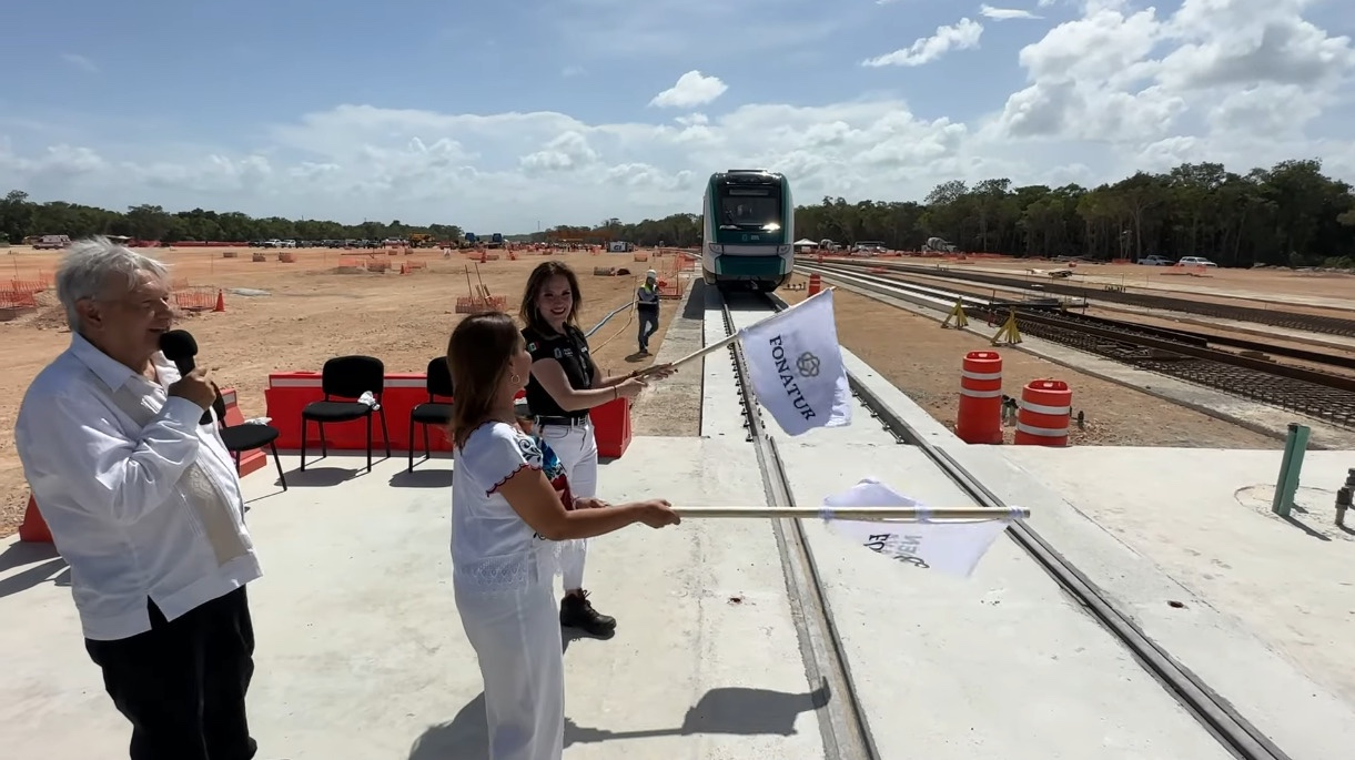 En el video, se ve al vagón del Tren Maya moviéndose hacia la zona donde se ubica el mandatario federal y sus invitadas.