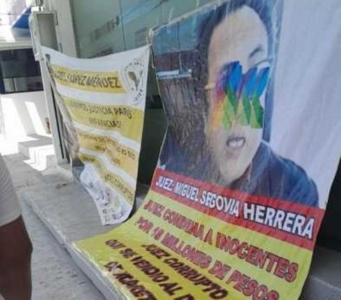 Afuera de estas instalaciones, las activistas colocaron mantas con información de los jueces acusados de corrupción e hicieron un llamado a la ciudadanía para anular su voto.