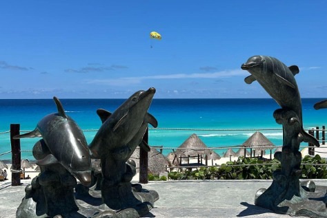Se informó que la efigie que se divide en dos partes y contiene en total cinco delfines, anteriormente estaba ubicada en el Parque de las Palapas y ahora luce en uno de los corredores entre la banqueta y un mirador, con un escenario majestuoso que es el mar azul turquesa del Caribe Mexicano, para disfrute de todos los bañistas.