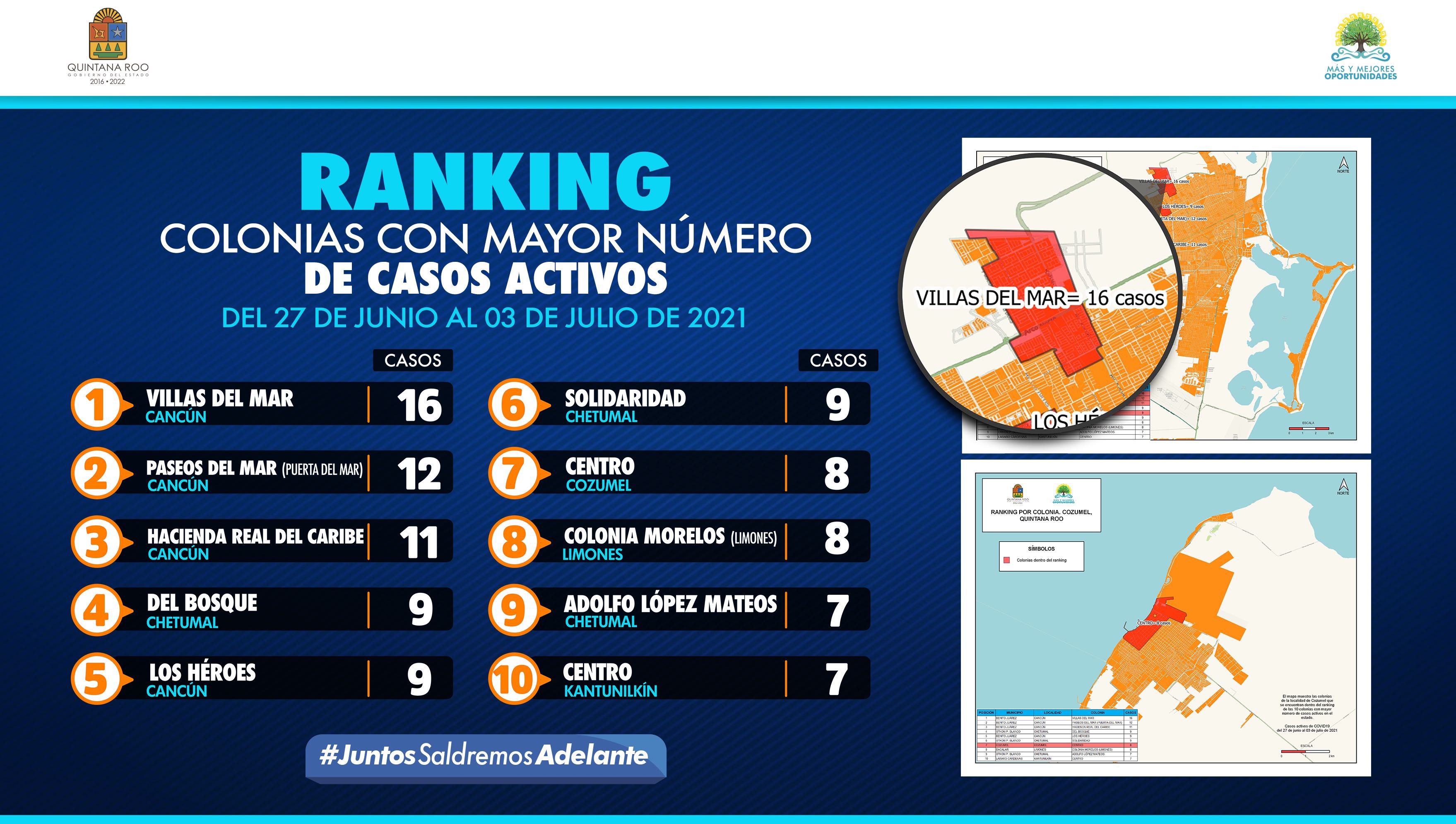 El primer lugar lo ocupa la colonia Villas del Mar, en Cancún, con 16 casos; le sigue Paseos del Mar, de Cancún, con 12 casos y Hacienda Real del Caribe, de Cancún, con 11 casos.