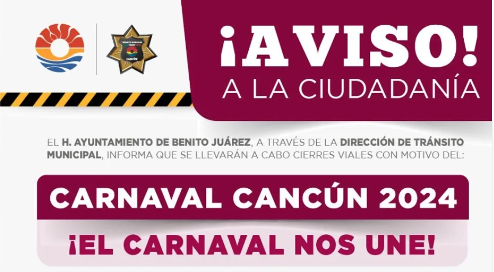 Debido a la gran fiesta del Carnaval Cancún 2024, las autoridades municipales, a través de la Dirección de Tránsito Municipal, informan a la ciudadanía el cierre de calles por las diferentes actividades que se van a desarrollar del 08 al 13 de febrero, en el centro de la ciudad de Cancún.