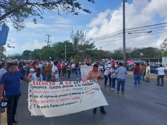 Inician maestros a manifestarse contra la reforma a la Ley del Issste 2025; salen de la Secretaría de Educación de Quintana Roo (SEQ) en la avenida Bonampak que ya se encuentra cerrada por los elementos de Tránsito.
