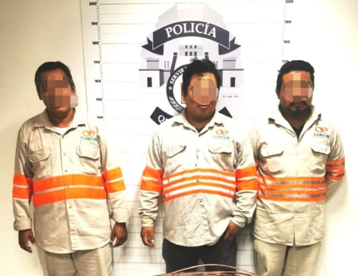 Elementos de la Policía Quintana Roo logran la detención oportuna de tres personas que presuntamente laboran para una concesionaria de alumbrado público al momento que se estaba sustrayendo cableado de cobre dejando a vecinos sin luz en la región 221 de la ciudad de Cancún.