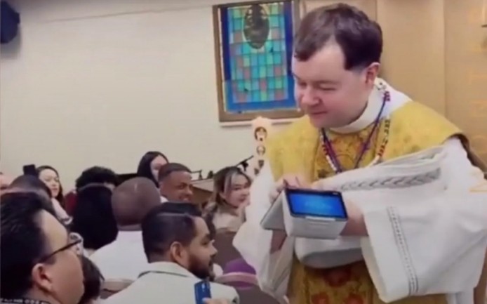 El protagonista del momento fue el padre Adam Kotas, quien fue grabado mientras ofrecía a los feligreses la opción de realizar sus aportaciones mediante tarjeta, dejando atrás el tradicional efectivo.