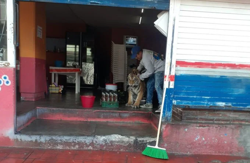Un tigre fue captado deambulando por las calles del municipio de Mixquiahuala, en Hidalgo, y que terminó por colarse a una taquería.