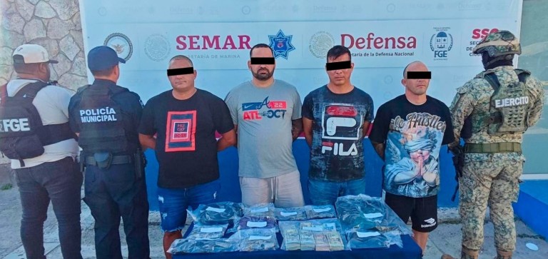 Los detenidos son los cubanos Yordany “N”, Seidel Rezk “N”, Oslei “N” y el mexicano Rafael “N”, a quienes además de un vehículo marca Chrysler, les aseguraron hierba verde y seca con las características de la marihuana, así como dinero en efectivo por la cantidad de 75 mil 489 dólares americanos y 3 mil pesos mexicanos.