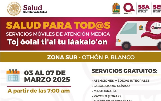 Para brindar a la población servicios de salud gratuitos, con los más altos estándares de calidad, del 03 al 07 de marzo a partir de las 7 de la mañana, las caravanas médicas móviles estarán en los municipios de Othón P. Blanco, José María Morelos y Solidaridad.
