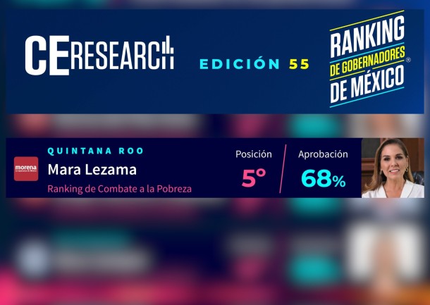 Mara Lezama, ocupa el 5to lugar en la encuesta de Ce Research, como la gobernadora que más combate a la pobreza en su entidad, Quintana Roo.