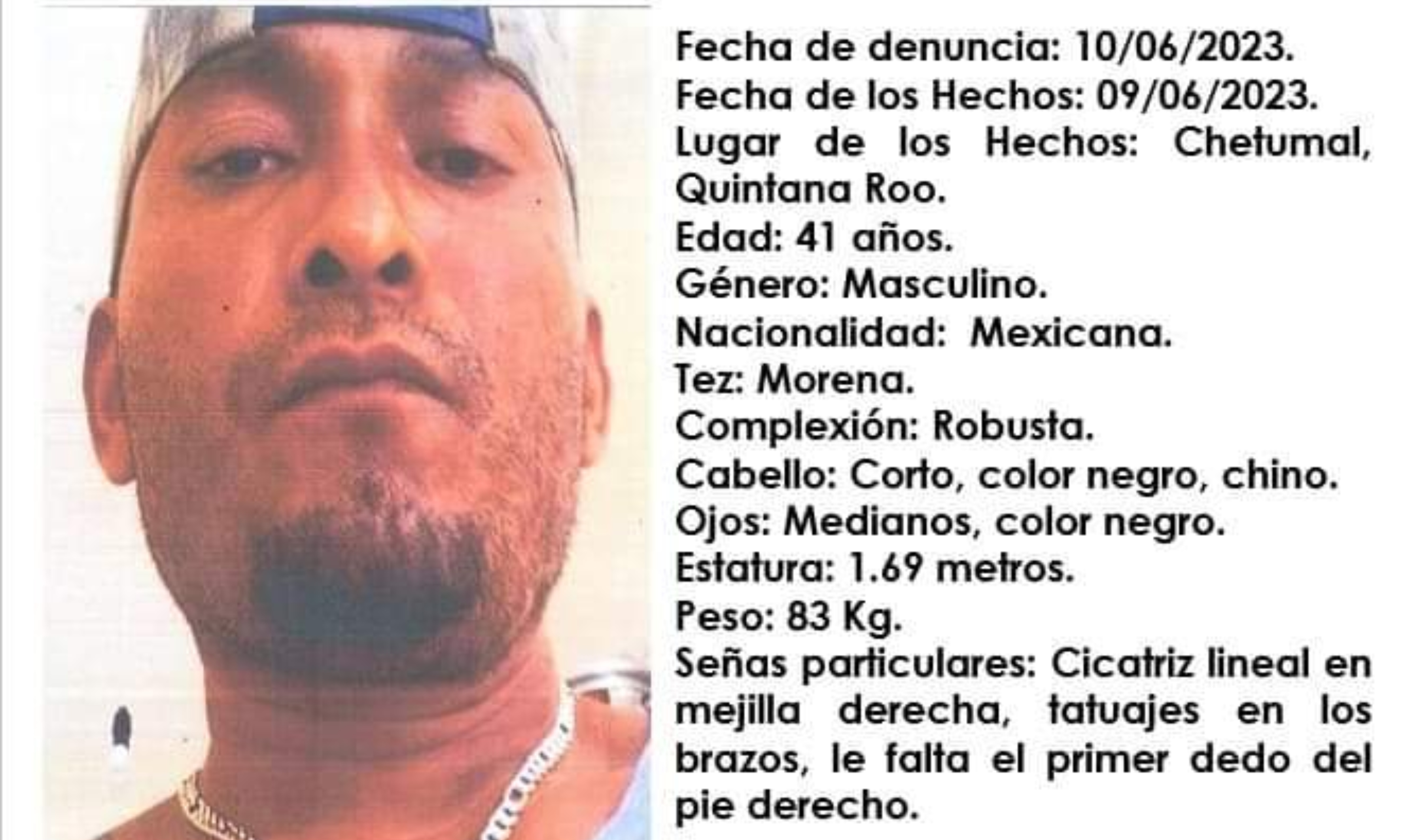 Al momento de su desaparición, el hombre vestía playera color negro, pantalón de mezclilla color azul y tenis color negros. Como señas particulares, tiene una cicatriz lineal en la mejilla derecha, tatuajes en los brazos y le falta el primer dedo del pie derecho.