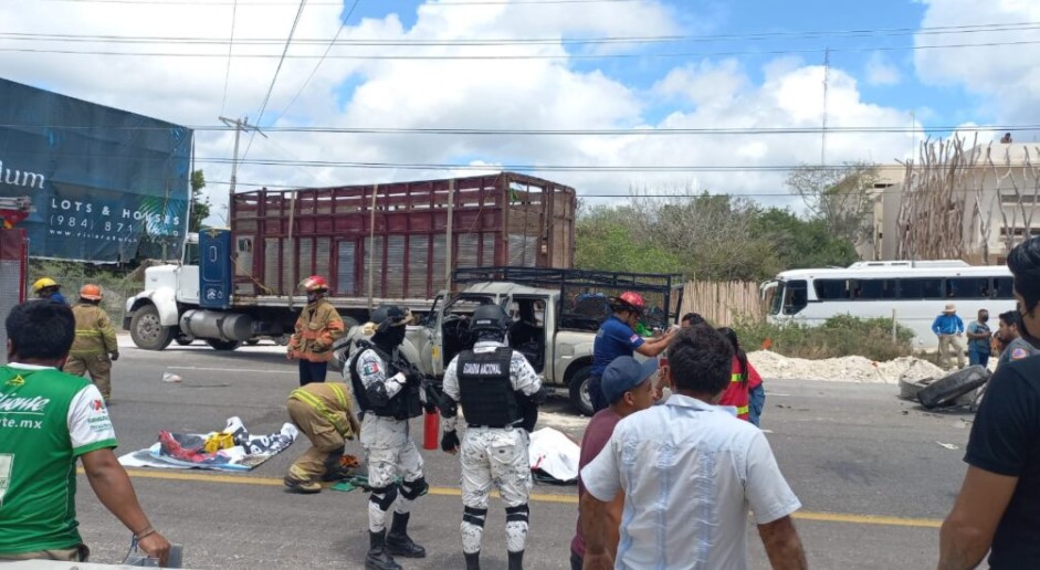 TULUM, MX.- Una camioneta llena de trabajadores que eran transportados a una obra chocó esta mañana contra un camión tipo torton, lo que causó la muerte de una persona y dejó a varias más lesionadas, en la carretera federal 307.