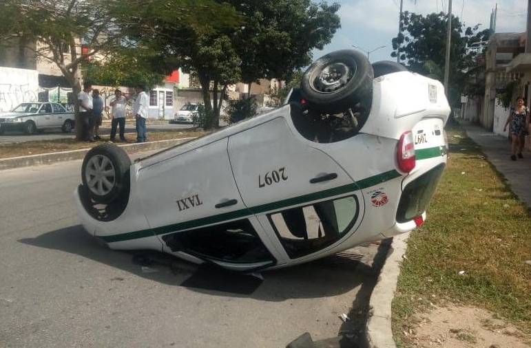 El taxista al intentar evitar el impacto pierde el control de su unidad sufriendo una aparatosa volcadura, resultando con lesiones leves.