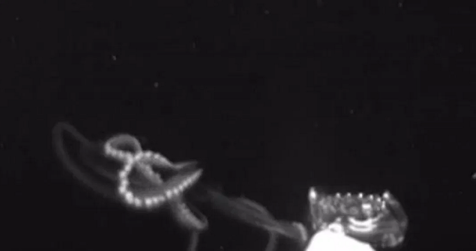El video fue filmado desde una plataforma de observación pasiva de aguas profundas equipada con una cámara. Los investigadores le agregaron un cebo artificial: una medusa artificial, bautizada como E-jelly, equipada con luces que imitan la bioluminiscencia azul que emiten las medusas Atolla wyvillei.