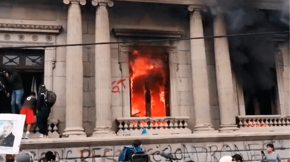 Varias personas quebraron ventanales y lanzaron artefactos que originaron fuego dentro de las instalaciones del Congreso de la República de Guatemala, mientras otro grupo de manifestantes se encuentra en la Plaza de la Constitución.