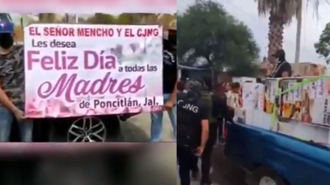 En las imágenes se puede observar a los repartidores en una camioneta de redilas con una lona en la que se podía leer lo siguiente: “El señor Mencho y el CJNG les desea Feliz día a todas las Madres”.