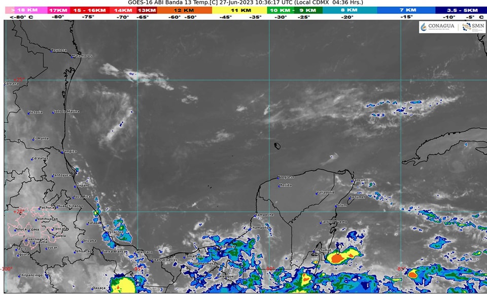 1.- Continúa el ingreso de aire marítimo tropical con variable contenido de humedad proveniente del Mar Caribe y del Golfo de México hacia la región peninsular, mantendrá cielo parcialmente nublado con incremento de nublados durante el día, lluvias que podrán ser moderadas con chubascos acompañados de actividad eléctrica y rachas fuertes de viento de 40 a 50 km/h en zonas de tormenta sobre la mayor parte del Estado de Quintana Roo, las temperaturas serán muy calurosas a bochornosas en el transcurso del día y cálidas a calurosas por la noche y madrugada sobre el Estado.