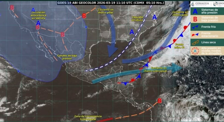 Una vaguada en altura localizada sobre el golfo de México y la masa de aire ártico asociada al frente número Cuarenta y uno, mantendrá viento fresco de componente norte y tiempo mayormente estable sobre la península de Yucatán, en el estado de Quintana Roo, prevalecerá cielo medio nublado, lluvias y chubascos aislados (acumulados menores a 5 mm), ambiente cálido durante el día y fresco a templado por la noche y al amanecer. Viento de componente norte con rachas de hasta 50 km/h principalmente sobre las zonas de costa del estado con oleaje de 1 a 2 metros de altura.