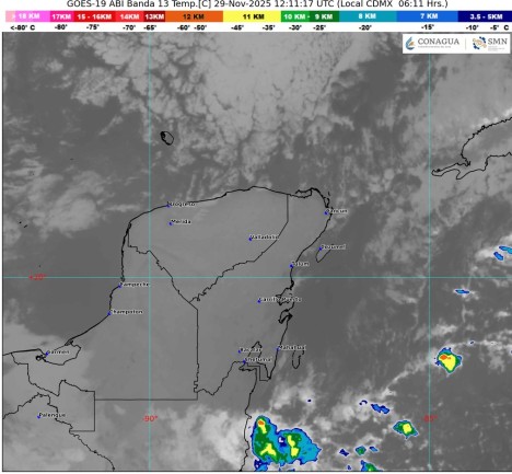 Un canal de baja presión localizado sobre el occidente del mar Caribe, originará en el estado de Quintana Roo cielo nublado, intervalos de chubascos con lluvias puntuales fuertes (acumulados de 25 a 50 mm) y actividad eléctrica.
