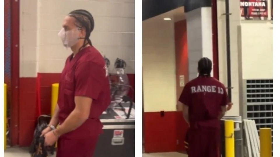 El jugador levantó polémica con su ‘outfit’, un traje en color guinda con la leyenda de ‘Rango 13’ en el dorsal, al tiempo de cargar en las manos una playera negra con vivos amarillos.