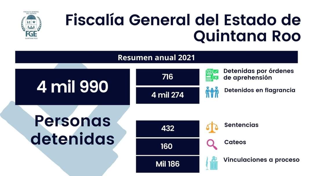 La Fiscalía General del Estado de Quintana Roo informa que durante el año 2021 se logró la detención de 4 mil 990 personas, de las cuales, 4 mil 274 fueron puestas a disposición por los diferentes cuerpos policiales en la entidad. Asimismo 716 personas fueron capturadas en cumplimiento a órdenes de aprehensión.