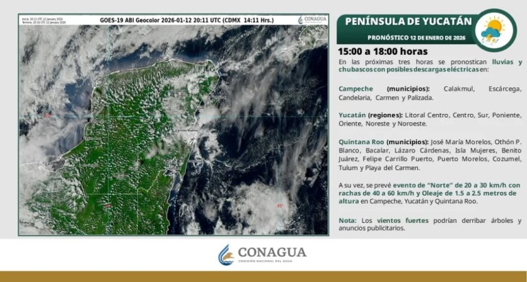 De acuerdo con información del Servicio Meteorológico Nacional, en las próximas horas se pronostican lluvias y chubascos con posibles descargas eléctricas en los municipios de José María Morelos, Othón P. Blanco, Bacalar, Lázaro Cárdenas, Isla Mujeres, Benito Juárez, Felipe Carrillo Puerto, Puerto Morelos, Cozumel, Tulum y Playa del Carmen.