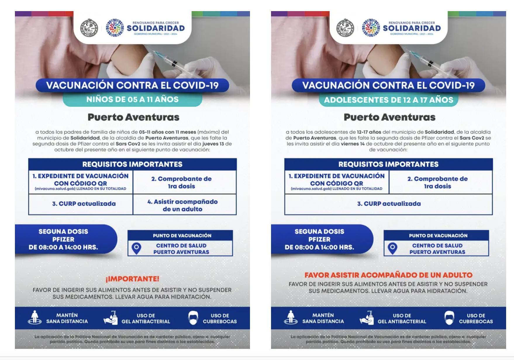 Hoy jueves y mañana viernes se aplicará la segunda dosis de vacunas contra el Covid-19, como parte del trabajo conjunto del gobierno de Lili Campos con los tres órdenes de gobierno, que tiene como fin salvaguardar la salud de la infancia solidarense. Serán dos mil dosis del biológico de la marca Pfizer.