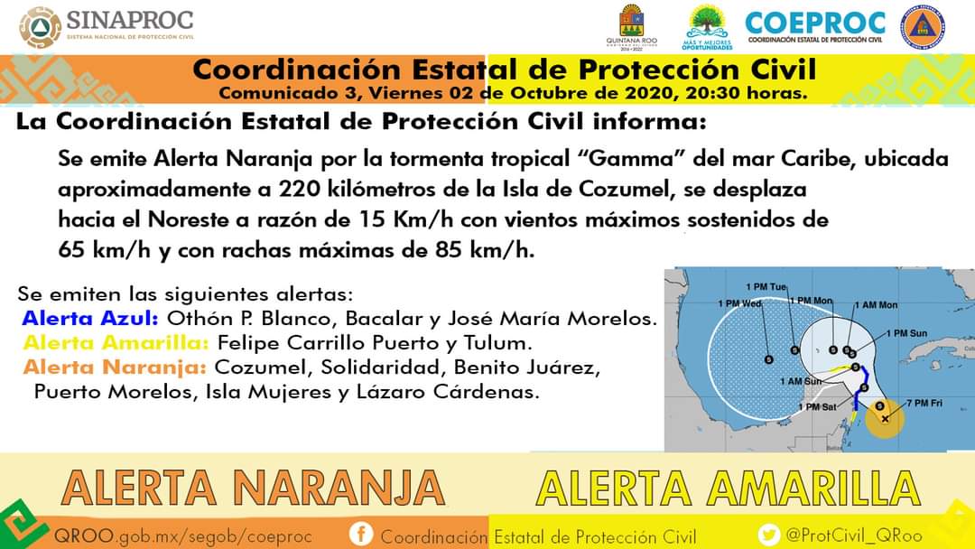 CHETUMAL. – La Coordinación Estatal de Protección Civil declaró Alerta Naranja para los municipios de Solidaridad, Cozumel, Benito Juárez, Puerto Morelos, Isla Mujeres y Lázaro Cárdenas por la cercanía de la Tormenta Tropical Gama.