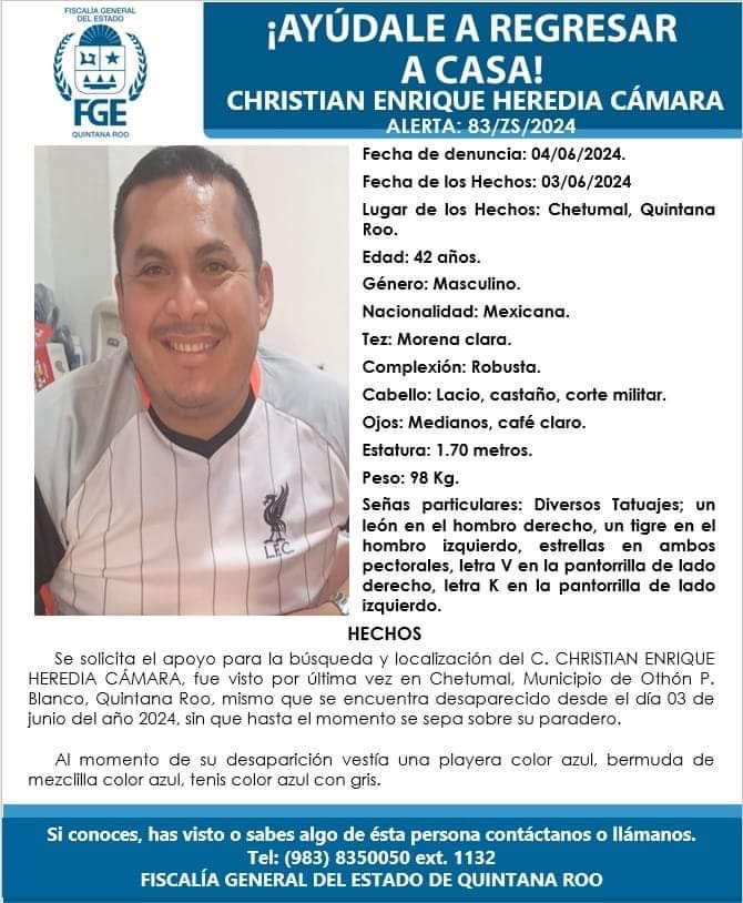 La Fiscalía General del Estado (FGE) emitió la ficha de búsqueda para localizar a Christian Enrique Heredia Cámara, oficial de la Policía Estatal Preventiva (PEP) que está desaparecido desde el pasado lunes 3 de junio.