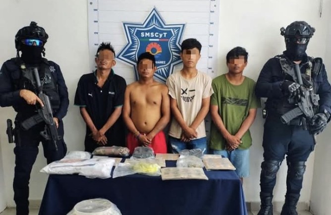 Elementos de la Secretaría Municipal de Seguridad Ciudadana y Tránsito (SMSCyT) de Benito Juárez detuvieron a cuatro personas del sexo masculino en inmediaciones de la Supermanzana 308, delegación Alfredo V. Bonfil, presuntos implicados en delitos contra la salud en su modalidad de narcomenudeo.