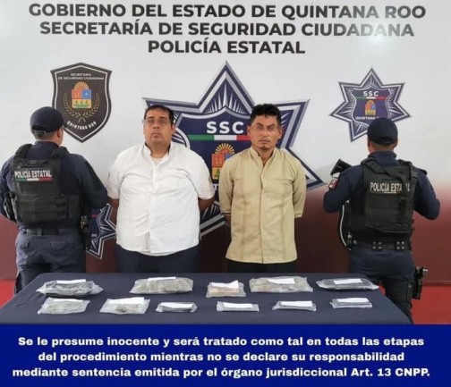 Se les decomisó: dos bolsas tipo mariconera; 89 bolsitas de plástico transparente que contenían vegetal verde y seco, con características similares a la marihuana; la cantidad de 24 mil pesos mexicanos en billetes de diferentes denominaciones; cuatro celulares, y dos vehículos de la marca Suzuki, uno tipo XL7, color blanco, y otro tipo Ertiga, color blanco con franjas verdes, rotulado como taxi, ambos con placas de circulación del estado de Quintana Roo.